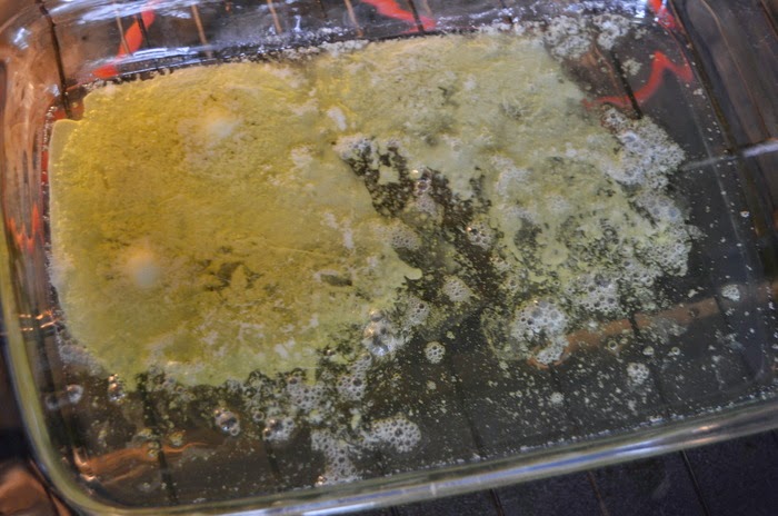 First up, cut up your butter into hunks and put them in your 13x9 pan. Put that pan in the oven and preheat it to 350. (One dish.)
